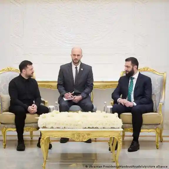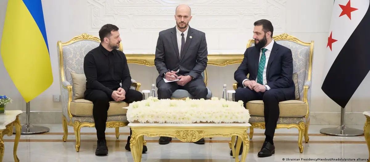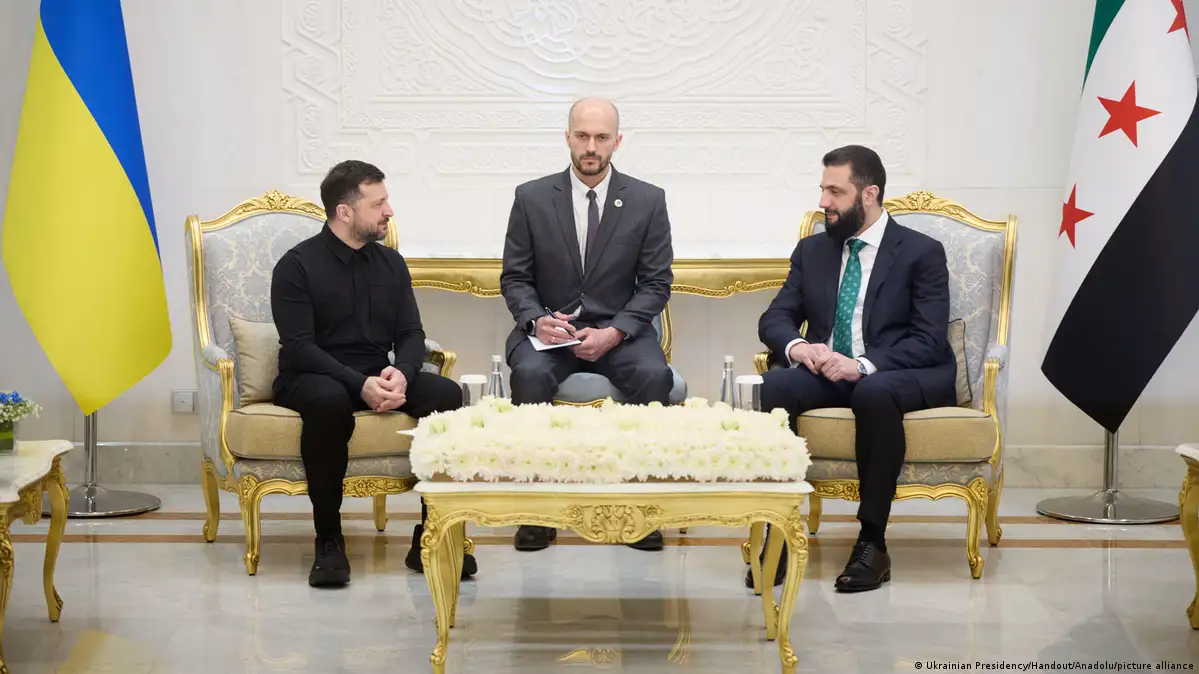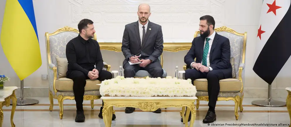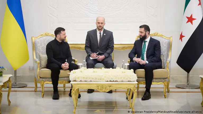 واجتمع زيلينسكي، الذي يواصل جولة في دول الشرق الأوسط، مع نظيره السوري أحمد الشرع في دمشق. وهذه أول زيارة للرئيس الأوكراني إلى سوريامنذ عودة العلاقات الدبلوماسية بين البلدين بعد الإطاحة بحكم بشار الأسد في أواخر 2024.