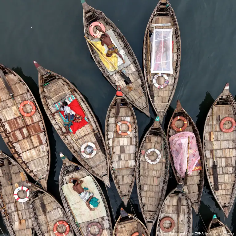 Das Boot als Bett, das von den Wellen des Buriganga-Flusses bewegt die Bootsleute in Bangladesch in den Schlaf wiegt. Was von oben idyllisch anmutet, ist tatsächlich Zeugnis von Not und Armut: Die Menschen schlafen auf ihren Booten, um diese vor Diebstahl zu schützen und die Lebenshaltungskosten zu senken. Dabei ist der Buriganga extrem verschmutzt, das Wasser oft schwarz und stinkend.