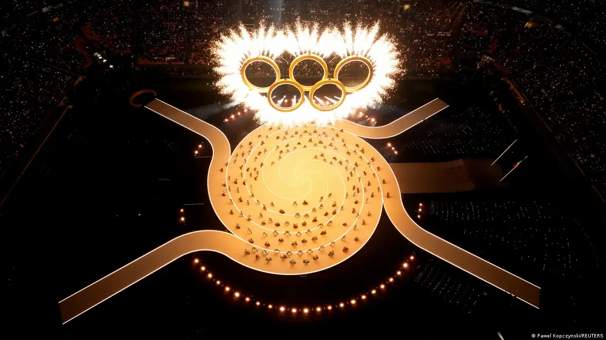 Direkt danach fluten 180 Tänzerinnen und Tänzer den Stadion-Innenraum. Während sie ihre gigantische Choreographie präsentieren, fliegen unter dem Stadiondach die fünf Olympischen Ringe hinein.