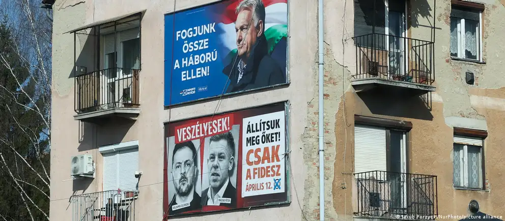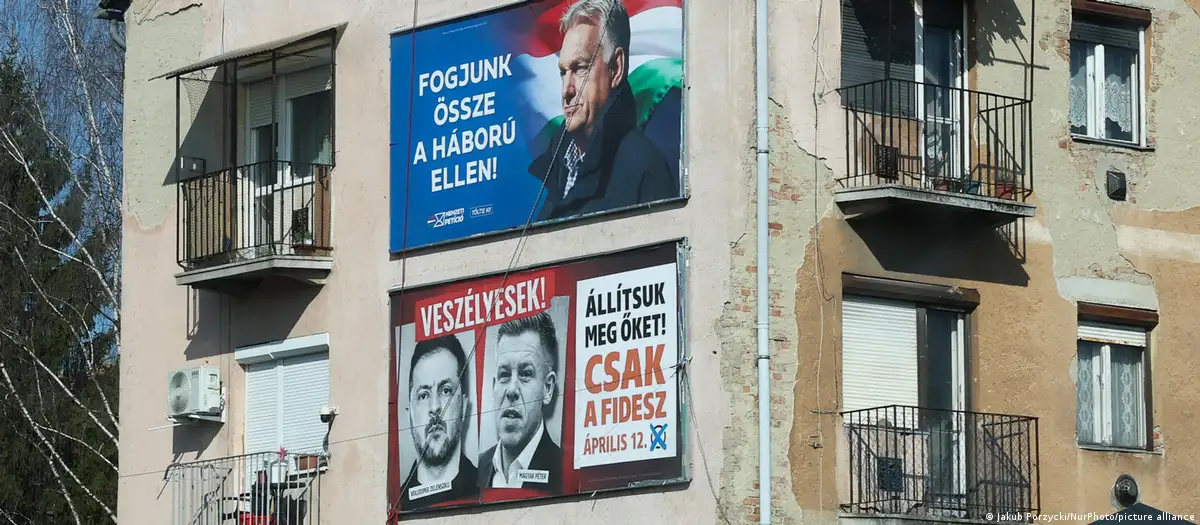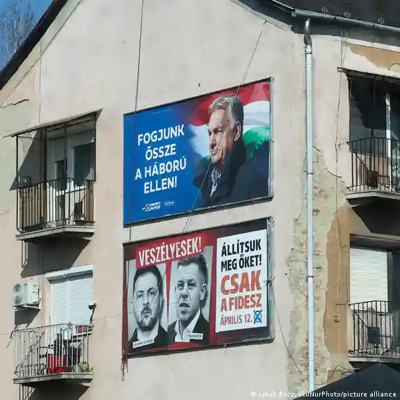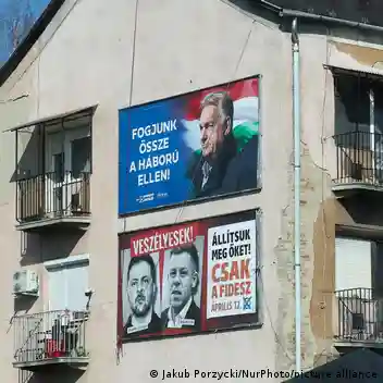 An einem Haus in Ungarn hängt Wahlwerbung für den amtierenden Premier Viktor Orban - und gegen Oppositionsführer Peter Magyar, der hier mit dem ukrainischen Präsidenten Wolodymyr Selenskyj gezeigt wird Bild: Jakub Porzycki/NurPhoto/picture alliance