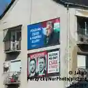 Auf einem Farbfoto ist die verwitterte Fassade eines Wohnhauses zu sehen, an der zwei große Plakate mit Porträtfotos angebracht sind, die die Gesichter von Männern und große Schriftzüge in ungarischer Sprache zeigen