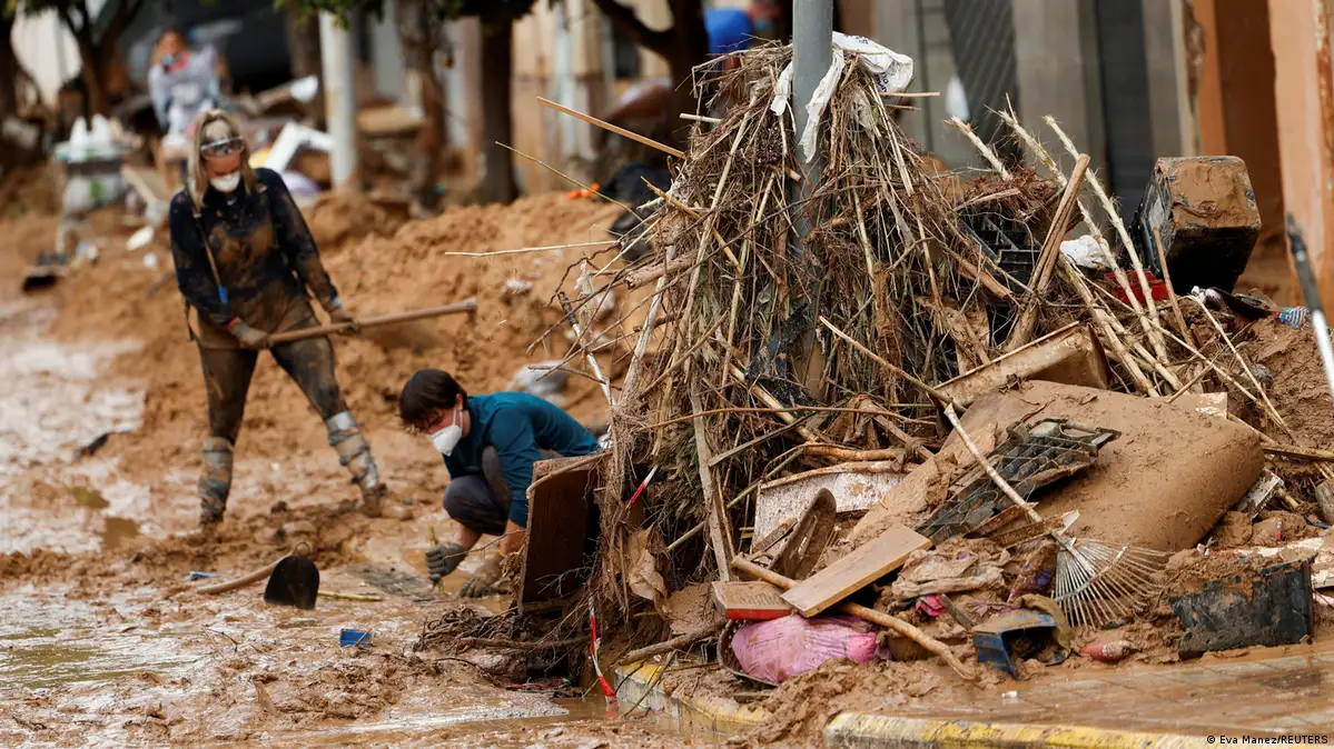 People remove mud on the road, following heavy rains that caused floods, in Paiporta, near Valencia, Spain on November 4, 2024
