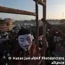 A Bahraini anti-government protester wearing a mask climbs a scaffold to photograph a protest, west of Manama, Bahrain.