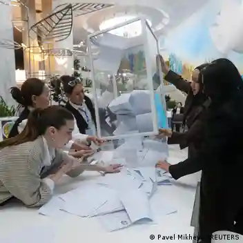 Members of a Kazakh electoral commission empty a ballot box