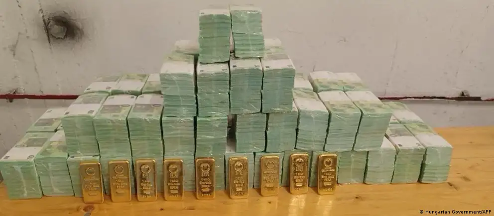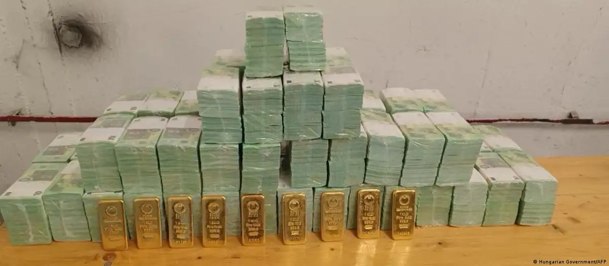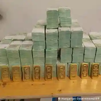 This handout photo, released by the Hungarian government on March 6, purportedly shows money and gold bars confiscated from two armored cash-transport vehicles traveling from Austria to Ukraine via HungaryImage: Hungarian Government/AFP