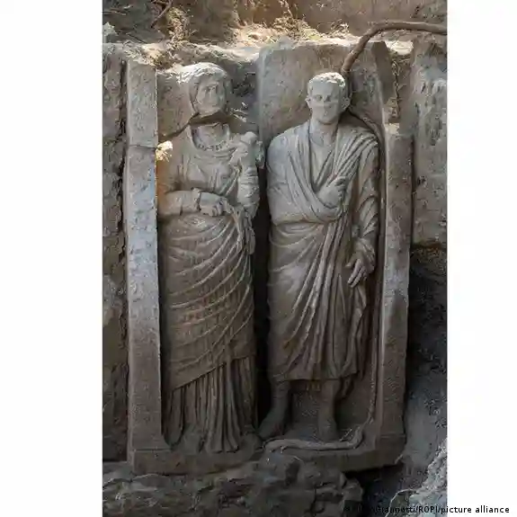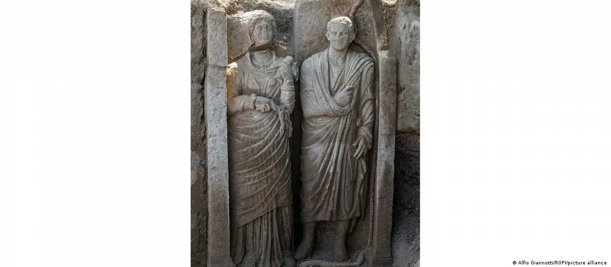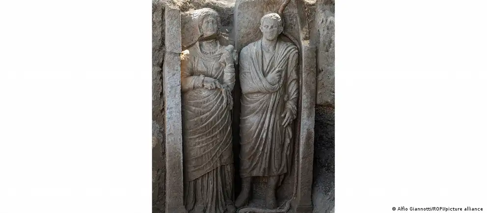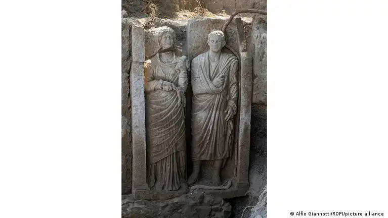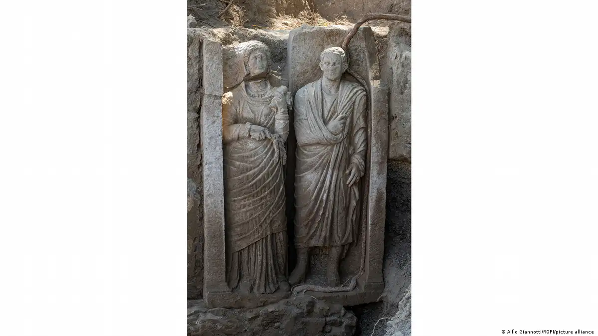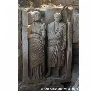 Una tumba monumental adornada con un relieve casi de tamaño natural de dos figuras humanas, que se cree que representan a una joven pareja casada, fue desenterrada durante excavaciones en la antigua ciudad de Pompeya en el sur de Italia.