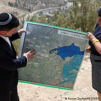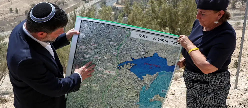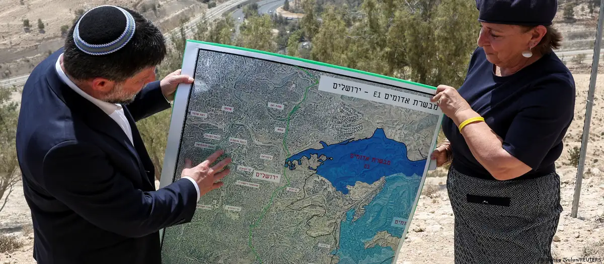 El ministro israelí de Finanzas, Bezalel Smotrich, sostiene un mapa que muestra el proyecto de asentamiento E1, congelado desde hace mucho tiempo, y que separaría Jerusalén oriental de Cisjordania ocupadaImagen: Ronen Zvulun/REUTERS