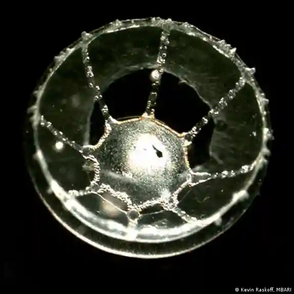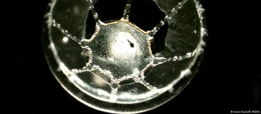 La medusa "Botrynema ellinorae" fotografiada en las profundidades abisales durante una expedición de investigación marina en 2002, mostrando las características morfológicas que determinan su distribución en el océano Ártico.Imagen: Kevin Raskoff, MBARI
