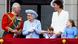 La reina, con un vestido azul celeste, pamela a juego y bastón en mano, salió al balcón junto a su primo el duque de Kent para saludar a los regimientos que desfilaron frente al balcón.