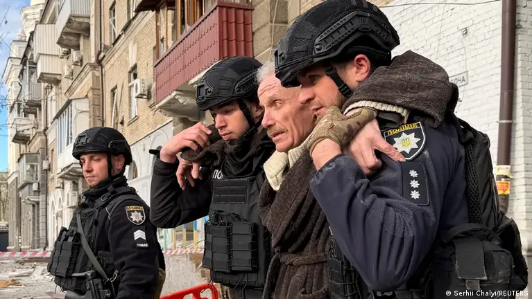 Policías evacuan a un hombre de un edificio atacado por los rusos el sábado 25 de abril.Imagen: Serhii Chalyi/REUTERS