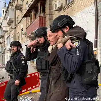 Policías evacuan a un hombre de un edificio atacado por los rusos el sábado 25 de abril.