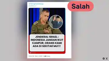Unggahan viral di X yang menyebut seorang jenderal Israel mengecam Indonesia agar tidak ikut campur dalam perang Iran , diposting pada 1 Maret itu telah dilihat sekitar 1,2 juta kali dan dibagikan lebih dari 1.800 kali.