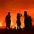 Silhuetas de cinco pessoas com um incêndio florestal ao fundo