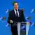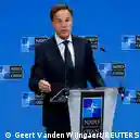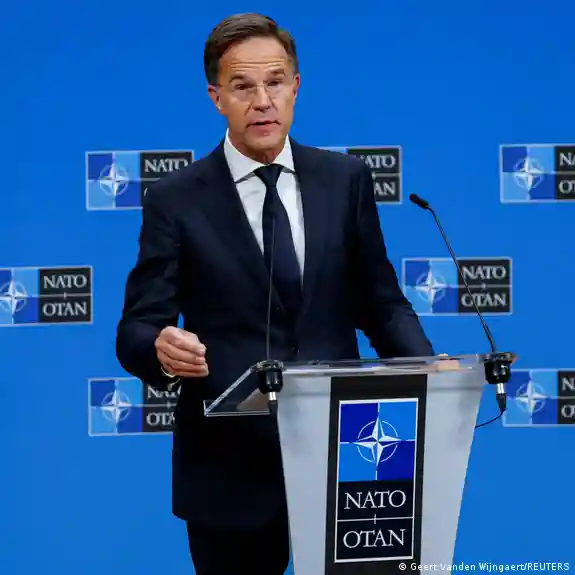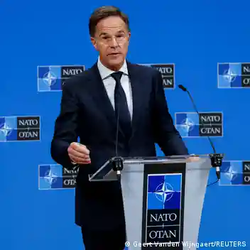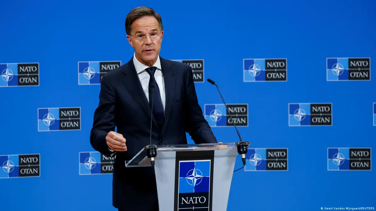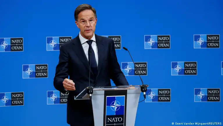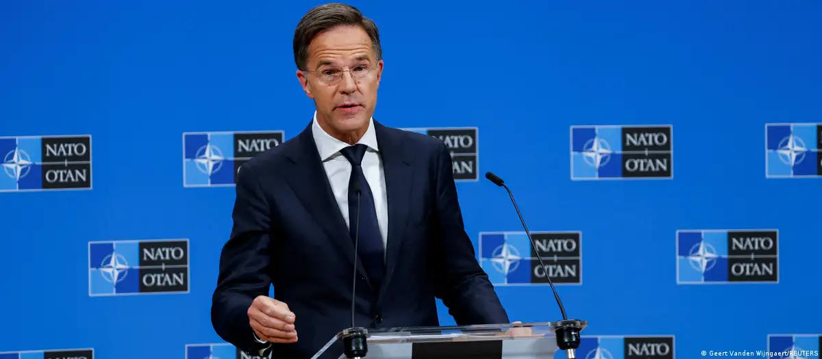 Bărbat la costum la un pupitru pe care scrie NATO: secretarul general al NATO Mark Rutte la o conferință de presă
