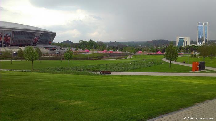 Зеленый газон на "Донбасс Арене", которая три года назад принимала чемпионат Европы по футболу, как и тогда в полном порядке. По-прежнему красив и ухожен и парк вокруг стадиона, откуда открывается прекрасный вид на донецкие терриконы. Сейчас в парке - все почти как в мирное время, только безлюдно.