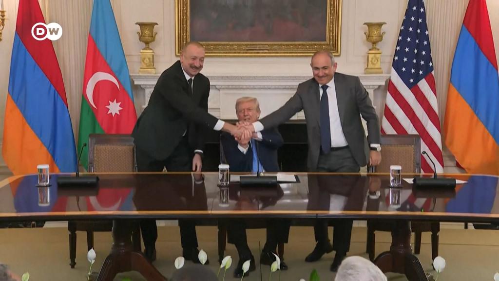 Армения и Азербайджан подписали соглашение о прекращении боевых действий. Теперь на Кавказе появится "Маршрут Трампа" - так будет называться путь, соединяющий основную территорию Азербайджана с эксклавом Нахичевань. Как проходила церемония подписания cоглашения - смотрите в нашем сюжете.