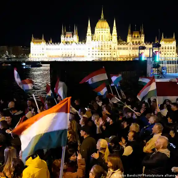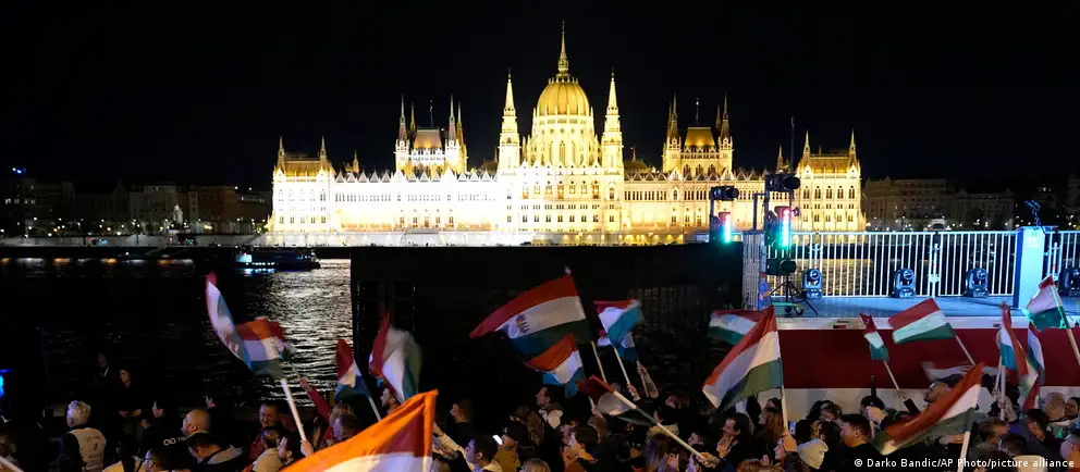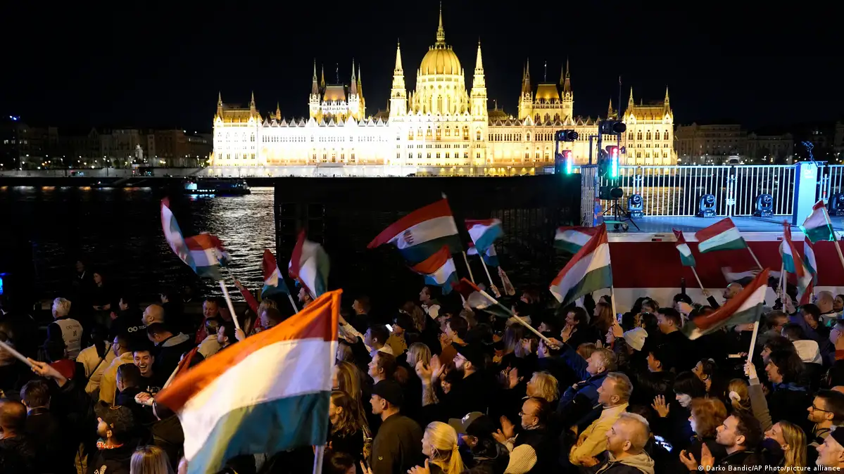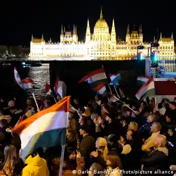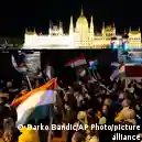 Сторонники Петера Мадьяра празднуют в Будапеште победу его партии "Тиса" на выборах в парламентФото: Darko Bandic/AP Photo/picture alliance