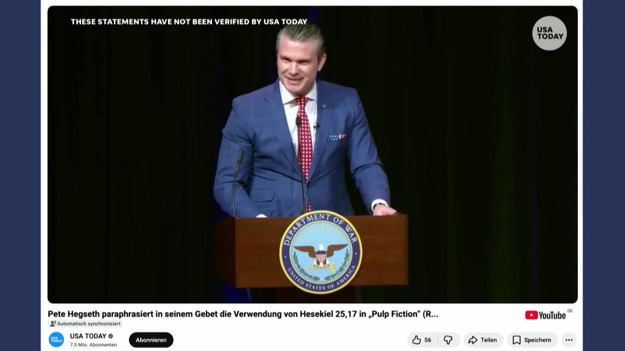 На богослужении в Пентагоне глава ведомства прочитал "поисково-спасательную" молитву военных летчиков США. По словам Пита Хегсета, она восходит к Ветхому Завету. Однако многие увидели в этом прямую цитату из фильма Квентина Тарантино "Криминальное чтиво".