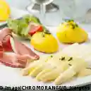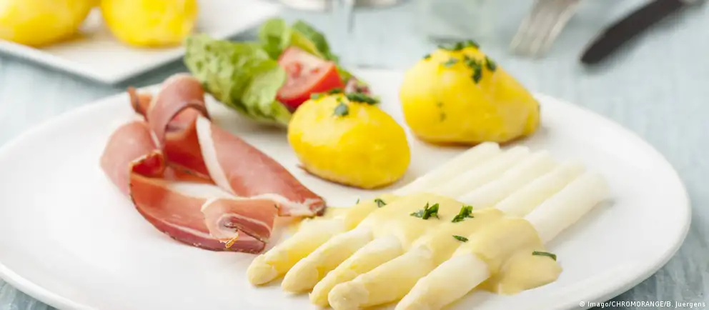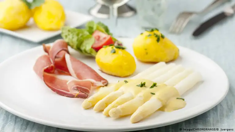 Спаржа с картофелем, ветчиной и голландским соусом - один из распространенных классических вариантовФото: Imago/CHROMORANGE/B. Juergens