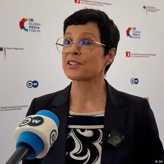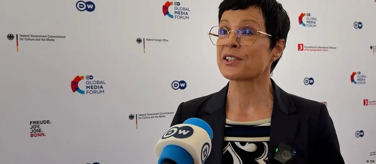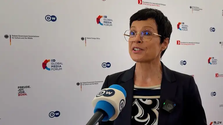 Marta Kos me mikrofonin e DW përpara, në sfond murin e Global Media Forum